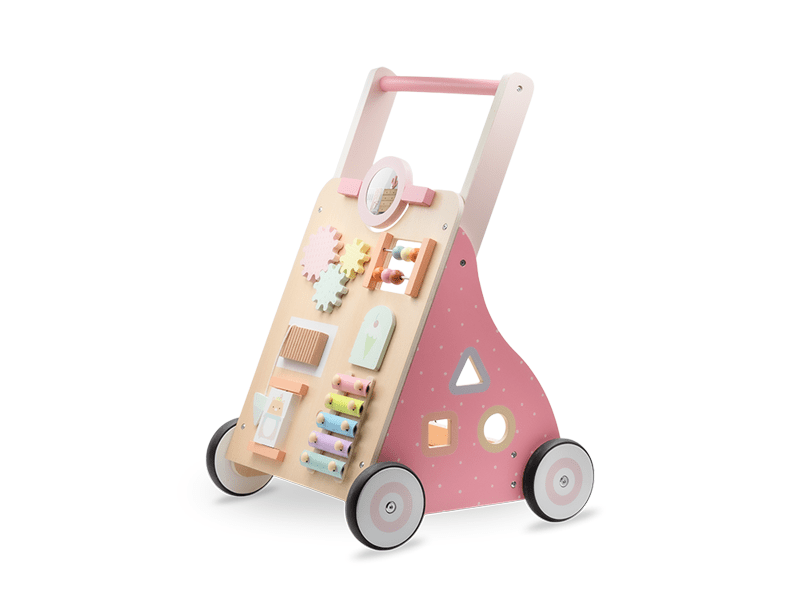 Ecni, luani dhe mësoni! Ky shëtitës prej druri ofron aktivitete të ndryshme që mbështesin zhvillimin e aftësive motorike të fëmijëve tuaj. Përmban aktivitete për të zbuluar dhe zotëruar. Për shkak të dizajnit të tij të fortë, është i përshtatshëm për të mësuar vogëlushët, të cilët janë gati për hapat e tyre të parë. Rrotat e gomës sigurojnë që të mos merrni gërvishtje në dysheme.